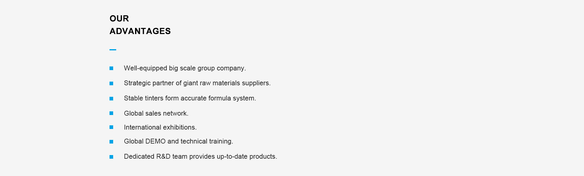 Professional Automotive Refinish Manufacturer, the main products including auto paint tinters, primer, putty, clearcoat, bedliner and other auxiliaries
