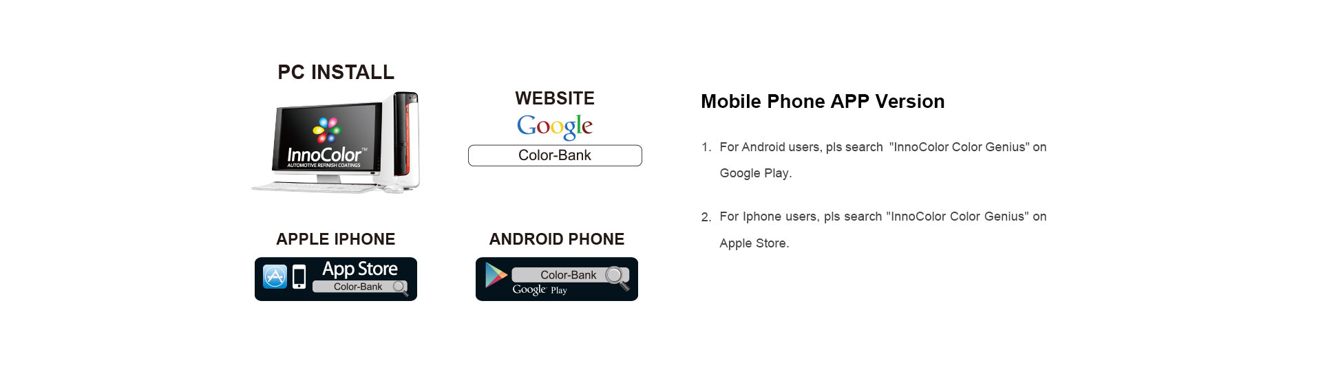 InnoColor formula retrieval tool of PC version, cellphone APP version and Web-online version are available.